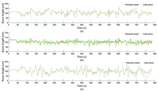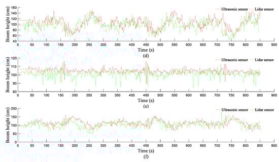 Figure 13 shows the Hb values detected by the LiDAR and ultrasonic sensors in the rotary-tilled and WS fields, respectively. As demonstrated in Figure 13, the Hb values detected by the two sensors show similar trends. Currently, ultrasonic sensors are the main type of sensor used to detect Hb, and detection data from ultrasonic sensors can reflect changes in Hb well, which further demonstrates that LiDAR sensors can satisfactorily reflect changes in Hb and can be employed to detect changes in Hb. In addition, the Hb values detected by the two sensors in the rotary-tilled field are basically the same, whereas there is a difference between the Hb values detected by the two sensors in the WS field. Moreover, in the WS field, the Hb values detected by the LiDAR sensor were lower than those detected by the ultrasonic sensor. For a boom sprayer, Hb changes less in the middle section of the boom than at the two ends of the boom. The changes in Hb monitored by the two sensors for the middle section of the boom can reflect the distances detected within the canopy. Figure 13b,e show the Hb values detected by the two sensors in the middle section of the boom. As demonstrated in Figure 13b,e, the distance detected by the LiDAR sensor is lower than that of the ultrasonic sensor within the WS canopy, and the distances detected by the LiDAR sensor for the WS canopy fluctuate to a relatively large extent, which further demonstrates that the distances detected by LiDAR sensor for the WS canopy include the WS canopy and roots.