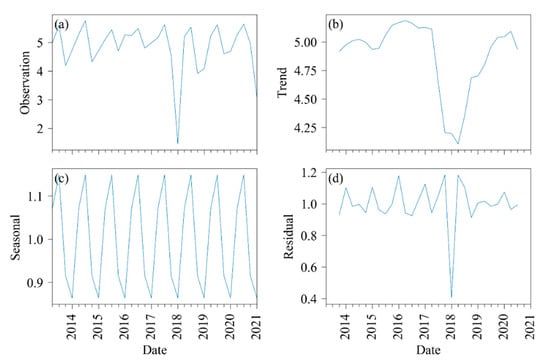 Decomposition analysis for the long-term LAI in the Apiacás (2013–2020). (a) LAI is decomposed into (b) trend, (c) seasonal, and (d) residual. The full-year LAI is separated into four quarters. Then, the mean value of each quarter is calculated and is used for time series analysis.