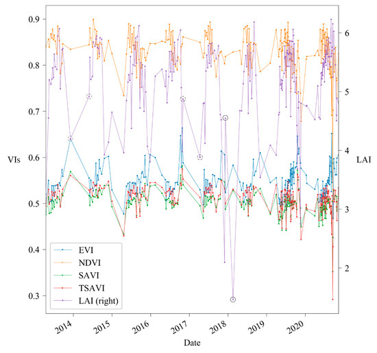 The variations of VIs and LAI time series are plotted in Figure 4. It allows one to compare the performance of VIs on LAI estimation. The VIs were calculated with the default soil adjustment factor (XSAVI = 0.5, XTSAVI = 0.08, and XEVI = 1). LAI values ranged from 2 to 6.5. NDVI had the highest value over the entire period (i.e., values from 0.7 to 0.9), followed by EVI (i.e., values from 0.4 to 0.7). SAVI and TSAVI shared almost the same range, from 0.2 to 0.6. These high values suggest that the area has high foliage coverage. Besides, Figure 4 shows that VIs can be indicators or not of LAI’s trends depending on time. The solid circles highlight a period when LAI has a trend opposite to that of all VIs. The slash circles highlight a period when the trend of LAI is consistent with NDVI while being opposite to other VIs. The dashed circles highlight a period when the trend of LAI is consistent with all VIs.