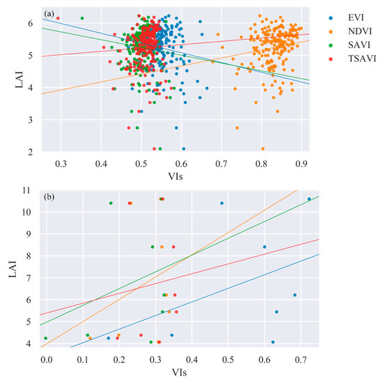 Scatter plot between VIs and (a) MODIS and (b) field measured LAI. The solid lines represent the trendlines of the linear regression model.