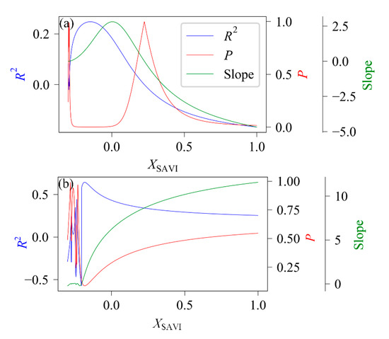 From both LAI data, we can observe that the best results mainly appeared for XSAVI between −0.18 and 0, indicating that negative XSAVI values were very satisfactory and behaved well compared to positive values. In the MODIS LAI data (Figure 6a), the negative R2 and slope appeared in the interval from 0.225 to 1 for XSAVI, indicating that the correlation between SAVI and LAI was extremely weak. Besides, the negative slope meant a negative relationship between LAI and SAVI. The maximin R2 (0.2472) and minimum P (0.0003) appeared at X = −0.148. The negative R2 and slope in the field measured data (Figure 6b) appeared for XSAVI between −0.3 and −0.2. Besides, R2 and P were found to be highly volatile in this region. The maximin R2 (0.6417) and minimum P (0.0863) appeared at XSAVI = −0.183. With XSAVI from −0.184 to 1, the performance of SAVI gradually worsened, with a decreasing R2 and an increasing P.
