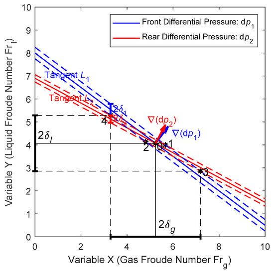 In addition to calculating and , the contour maps can also be used to estimate the relative error of the and , and the working principle is shown in Figure 11. The blue solid line (tangent ) in Figure 11 represents the tangent of the contour of the front DP , whilst the red solid line (tangent ) represents the tangent of the contour of the rear DP . Therefore, Point 0 corresponds to the working condition and its coordinates correspond to the gas/liquid flowrates. As and are measured by the same type of pressure transmitter, then the relative error of and are assumed the same, which is in this paper. The slopes of and are assumed to be and respectively, and it can be noted From Figure 11 that .