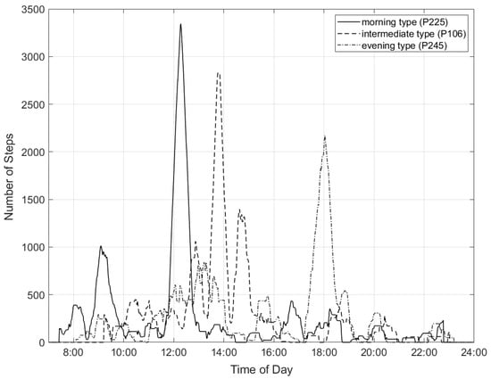 Figure 1 shows the comparison of the summed 30 min time intervals of the number of steps per minute for one subject from each chronotype group. The time of day at the peak of each curve indicates the beginning of the 30 min active period based on the step count for one participant of each chronotype group.