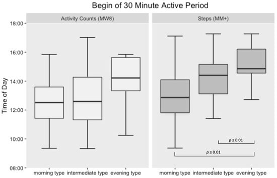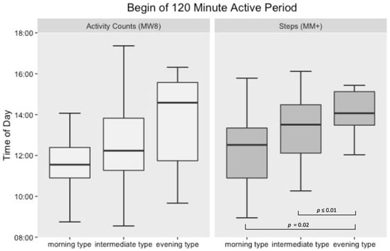 Compared to the morning type group, the intermediate type group showed a delay in their 30-min active period of approximately one hour (p ≤ 0.01) and the evening type group a delay of approximately two hours (p ≤ 0.01), respectively. These results were also found for the 120-min active period. Compared to the morning type group, the intermediate type group showed a delay of approximately one hour (p ≤ 0.01) and the evening type group a delay of approximately two hours (p = 0.02), respectively. No differences within the circadian aspects of the activity counts (MW8) were detected regarding the three chronotype groups for both the 30- and 120-min active periods.