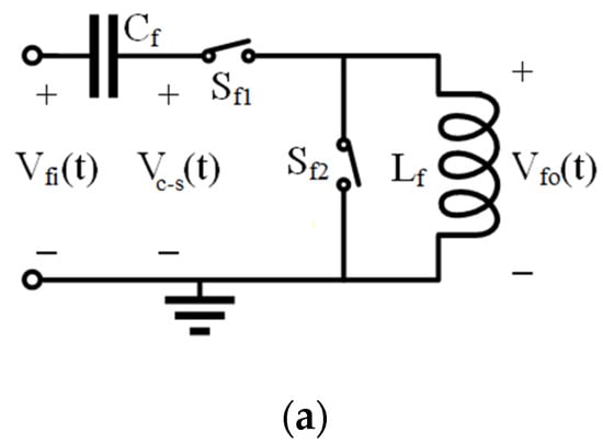 where Lf and Cf are the values of inductance and capacitance, respectively. By switching the inductor on and off, its effective value, Lfeff, seen at the circuit input, is changed, which changes the filter’s frequency characteristics. The two switches, Sf1 and Sf2, (Figure 1a) are driven by two antiparallel square signals, with switch Sf2 closing when Sf1 opens to provide a discharge current path for the inductor. The switching function F1(t) of the switch S1 is given as []: