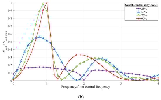 The switched inductor filter (shown in Figure 1a) consisting of a capacitor, Cf, inductor, Lf, and two switches Sf1 and Sf2, is used in power electronics to electrically tune the frequency characteristic of inverter outputs, suppressing unwanted harmonics [,]. Figure 1b shows the electrically tunable frequency characteristic of such a filter and the impact of the switch control function duty cycle as its tuning parameter. The input signal frequency was normalized with regards to the filter central frequency and the output voltage root mean square (RMS) was normalized with regards to the maximal filter output RMS voltage (obtained with the 90% duty cycle when the input signal frequency was equal to the filter central frequency).