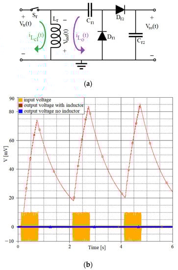 (a) Switched harvester on inductor with marked inductor current, iLcl(t) (green) and iLo(t) (purple) with the switch closed and opened, respectively. (b) Switched harvester on inductor output signal waveform (red) compared to a rectifier without the switched inductor (blue). Input signal (yellow): 500 ms of sinusoidal signal, 20 mV peak-to-peak, 100 Hz, followed by a 1.5 s pause. Cr1 = Cr2 = 1 µF, Lr = 100 mH, switch control frequency fswitch = 256 Hz, duty cycle 50%.
