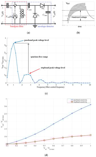 (a) Proposed sensor interface (with marked bandpass filter and envelope detector functional blocks), (b) output signal waveform (with marked headroom voltage), (c) normalized frequency characteristic and (d) normalized output headroom voltage with input voltage.