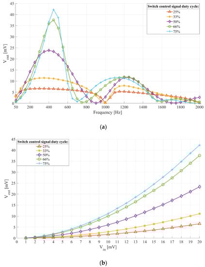 (a) Frequency characteristic and (b) output headroom voltage to input voltage relation of the sensor interface with switch control signal duty cycle. Filter central frequency 512 Hz (L = 100 mH, Cin = 1 µF, RL = 66.6 Ω). Switch control signal frequency fswitch = 1024 Hz and duty cycle from 25% to 75%. (a) Input voltage 20 mV peak-to-peak and frequency from 50 Hz to 2000 Hz with a 50 Hz step. (b) Input signal voltage from 1 mV to 20 mV with a 1 mV step. Input signal frequency 450 Hz.