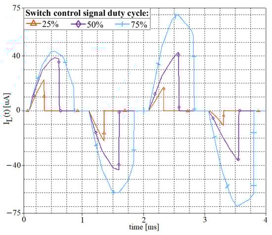 However, increasing the duty cycle leads to longer periods of time in which the sensor drives the interface, leading to an increased sensor current. This is shown in Figure 5, which depicts the inductor current with switch control signal duty cycle. The simulation model was the same as for Figure 4a,b, and the switch control signal duty cycle was 25%, 50%, and 75%.