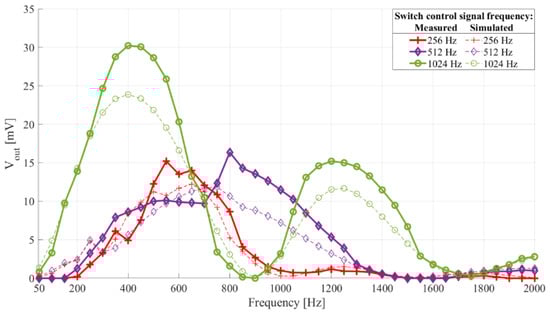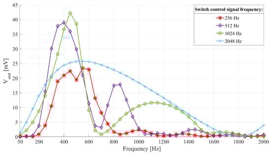 Figure 6 shows the interface frequency characteristics with switch control signal frequency, fswitch. The filter central frequency was 512 Hz (Cin = 1 µF, L = 100 mH, RL = 66.6 Ω (Q = 4.8335)). The switch control frequency was 256 Hz, 512 Hz, 1024 Hz, and 2048 Hz. The switch control signal duty cycle was 75%.