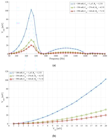 From Equation (1) it is clear that the same central frequency can be obtained with different values of inductance, L, and capacitance, C. This is shown in Figure 7a,b, which present the frequency characteristics and the relation of the output headroom voltage and input voltage of interfaces with different inductance and capacitance. The filter central frequency was 512 Hz, the switch control frequency was 1080 Hz, and the duty cycle was 75%. L were 100 mH, 350 mH, and 590 mH, and Cin, were 1 µF, 276 nF, and 164 nF, respectively. The Q factor was kept constant (Q = 267.3) by setting the resistance, RL, to 1.2 Ω, 4.2 Ω, and 7.1 Ω, respectively.