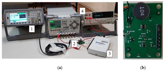 The prototype of the proposed frequency-selective voltage-boosting sensor interface was designed according to the schematic in Figure 3a, with components shown in Table 1.