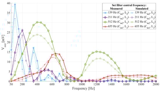 The filter central frequencies were: 139 Hz (Cin3, L2), 211 Hz (Cin2, L2), 512 Hz (Cin2, L1), and 655 Hz (Cin1, L2). The switch control signal duty cycle was 50% and the frequency was 256 Hz, 278 Hz, 422 Hz, 512 Hz, 1024 Hz, and 1310 Hz. The input signal voltage was 20 mV peak-to-peak and the frequency was ranging from 50 Hz to 2000 Hz, with a 50 Hz step.
