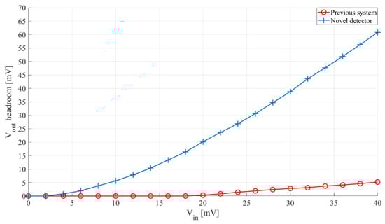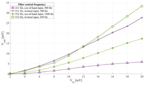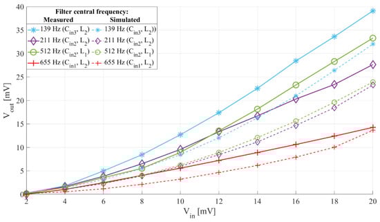 Figure 11 shows the measured and simulated output headroom voltage with input voltage of the interface whose frequency characteristics are shown in Figure 9, while Figure 12 shows the measured passband and stopband output-to-input voltage relation of two setups of the interface, with an input signal frequency of 200 Hz and 500 Hz for the 211 Hz filter central frequency setup, and 450 Hz and 1200 Hz for the 512 Hz filter central frequency setup.
