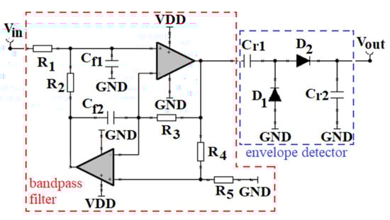 Schematic of the sensor interface consisting of an active GIC bandpass filter and a passive two-diode voltage doubler [,].