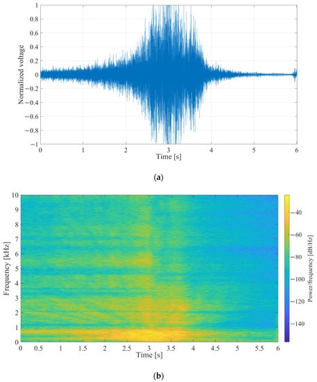 The signal waveform with normalized amplitudes and its spectrogram are shown in Figure 14a,b, respectively. The input signal is periodical, each period consisting of approximately 3 seconds of the passing speedboat, followed by around 3seconds of pause. The maximal input signal voltage was scaled from 2 mV to 20 mV peak-to-peak, in steps of 2 mV.