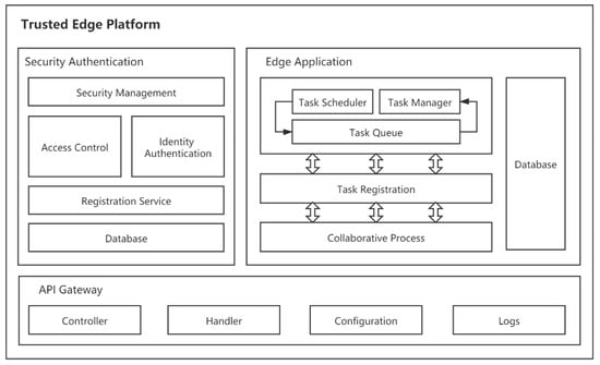 In order to integrate the capabilities of the edge computing framework and the blockchain network more efficiently, we propose a trusted edge platform based on microservice architecture. This platform has the characteristics of light-weight, ease of deployment, and high security. The proposed platform consists of three types of microservices, as illustrated in Figure 2. In the edge computing environment, the Edge Application Module acts as an access object for the rule engine of Edgex Foundry to provide extended services. Based on the Hyperledger Fabric blockchain, the Edge Application Module is able to build collaborative workflows among multiple edge servers to enable cross-domain cooperation. Security authentication implements registration services, identity authentication, security management, and access control with the help of the Hyperledger Fabric blockchain network. API gateway orchestrates services within the platform and exposes them as network interfaces for terminals and users to invoke.