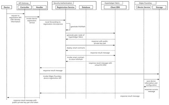 After system initialization, the user initiates a terminal device registration request to the API gateway. The request is forwarded to the registration microservice through the processor of the API gateway. The registration microservice hashes the terminal identity information transmitted by the user and obtains a virtual ID (VID) as proof of identity authentication. The registration service calls the Hyperledger Fabric service to create peer nodes and extract their public-private key pairs. When the peer node completes smart contract deployment, the registration service initiates a transaction process to store the InfoHash into the blockchain. The virtual ID (VID) used to query the InfoHash is returned when the transaction is completed. The registration service returns the public-private key pair and VID to the terminals. After that, the handler invokes the device service API of Edgex to register the necessary information and data communication configuration of the terminal. Figure 3 shows the sequence diagram for device registration.