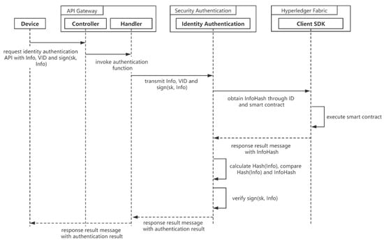 When accessing the authentication microservice, the terminal needs to submit the identity data identifier (VID), identity data (Info), and the terminal private key digital signature (sign (sk, Info)). The identity service obtains the corresponding InfoHash identity data through a smart contract based on the VID. After hashing Info and comparing whether Hash (Info) is equal to InfoHash, the authentication service can determine that the Info provided by the terminal is consistent and complete with the stored identity data. The identity authentication service ensures that the terminal has the corresponding private key by verifying the digital signature and proves that the identity data belongs to the terminal. After completing the above operation, the authentication service invokes a smart contract to record this authentication service on the blockchain. Finally, the authentication service returns the authentication result. Figure 4 illustrates the sequence diagram for identity authentication.