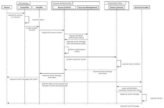 The terminal needs to determine its access rights before requesting services or obtaining resources. The API Gateway detects whether the endpoint request contains a token, and if there is no token, then the access control microservice needs to be invoked. The API gateway sends the terminal information and the information of the accessed service to the Access Control microservice. First, the access control service obtains the latest authorization policy from the security management microservice. After that, it runs the authorization policy and evaluates whether the visitor meets the authorization conditions. If the assessment is passed, the access control service invokes a smart contract to update the assessment result to the blockchain. After the smart contract is executed, it returns a token used to query the verification result. Finally, the access control microservice returns the token data. Figure 5 illustrates the sequence diagram for access request.