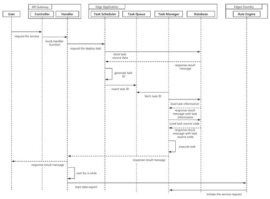 Before the terminal officially works after registration, users need to deploy application services on the Edge Application module. The user accesses the interface exposed by the API gateway and transmits the information about the target task. The Handler component simply processes the task information and forwards data to the task scheduler. The scheduler temporarily stores the task data in the database and generates a unique ID to identify the task. The task scheduler inserts the task ID into the end of the task queue. The task manager takes out the task ID from the task queue, then extracts the task information from the database and loads the task resources. After waiting for a while, the task starts to execute, and Edgex Foundry will export the data to the task data interface. Figure 6 illustrates the sequence diagram for smart application binding.