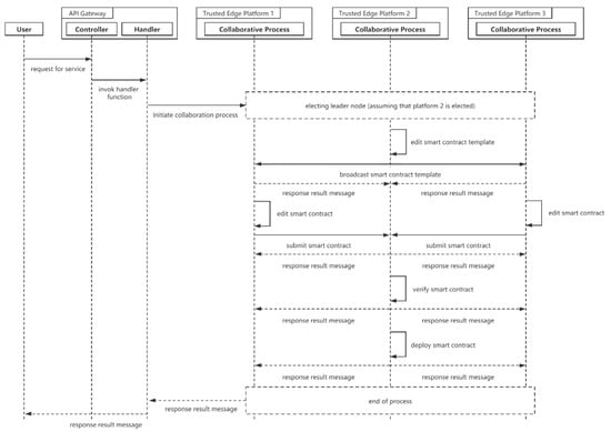 In order to increase the interaction between edge computing nodes, the Trusted Edge Platform provides collaborative process microservices to help multiple nodes establish cooperative relationships. The Channel mechanism of Hyperledger Fabric has data isolation, and multiple nodes can join the same Channel. The cluster of nodes elects the leader node based on the draft algorithm. After the leader node of the cluster is elected, the leader is responsible for organizing the members to write, verify and deploy the smart contract. The cluster then works according to the smart contract. Figure 7 illustrates the sequence diagram for the collaborative process.