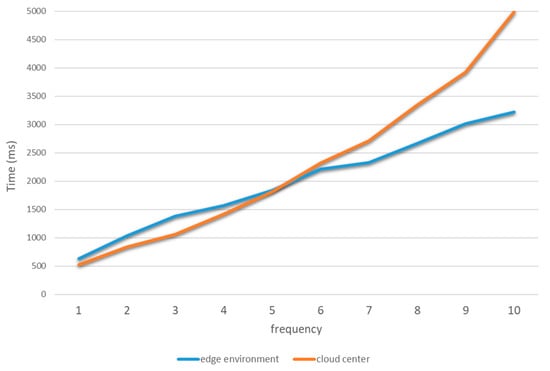 The data in Figure 11 shows that when the camera is located at a low sampling rate, the task flow done by edge computing based collaboration is about the same in terms of time consumption as the task flow done by cloud based services. The blockchain-based security mechanism running at the edge side consumes some of the time. However, when the camera acquisition frequency increases, the service latency of cloud services rises rapidly, while the rise of edge computing is relatively slow. It can be seen that the use of edge computing collaboration can increase the service response speed with greater throughput.