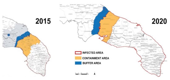 Map showing the spreading of Xylella fastidiosa in the Salento peninsula (adapted from [14,15] with permission.).