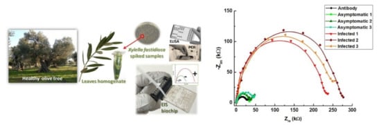 A LOC device for Xylella fastidiosa detection in olive trees, exhibiting large variation of EIS signals between asymptomatic trees (reporting impedance values close to the antibody baseline, around 30 kΩ) and symptomatic infected trees (resulting in a range above 200 kΩ) (adapted from [48]—licensed under the Creative Commons Attribution).