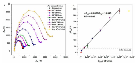 (a) Impedance changes obtained with Au/4-ATP/GA/anti-Psl/BSA electrodes, in the case of different concentrations of Psl; (b) linear relation between charge transfer resistance changes (ΔRct) and bacteria concentrations (on the right) (reproduced from [49], licensed under the Creative Commons Attribution).