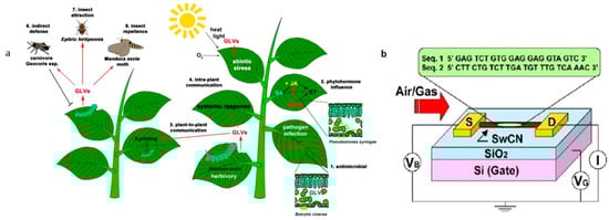 (a) Schematic representation of green leaf volatiles (GLVs) emission during herbivory, pathogen infection, and abiotic stress (reproduced with permission from [53], licensed under the Creative Commons Attribution). (b) Illustration of the experimental setup made by single-stranded DNA (ss-DNA) and single-walled carbon nanotube field effect transistors (swCN-FETs) (reproduced from [74] with permission.).