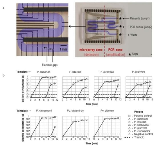 (a) A microfluidic chip allowing PCR and hybridization steps; (b) Electrical readout, demonstrating detection of five Phytophthora species (adapted from [87] with permission).