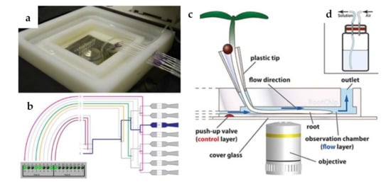 - Grossmann, G.; Guo, W.J.; Ehrhardt, D.W.; Frommer, W.B.; Sit, R.V.; Quake, S.R.; Meier, M. The RootChip: An integrated microfluidic chip for plant science. Plant Cell 2011, 23, 4234–4240. [Google Scholar] [CrossRef]