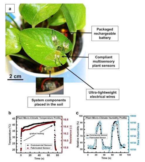 (a) Wearable sensors for real-time microclimate monitoring of temperature and humidity levels; (b) comparison between real-time response of fabricated and commercial temperature sensors, concerning temperature profile around the plant.; (c) real-time plot of fabricated humidity sensor in comparison to a commercial sensor’s behavior, concerning humidity levels around the plant (reproduced from [107], licensed under the Creative Commons Attribution).