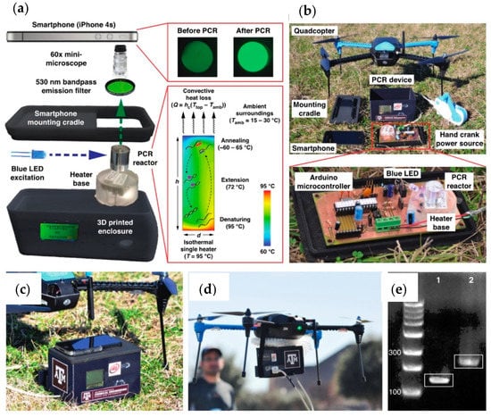 Lab-on-a-drone components: (a) the convective thermocycling with a single heater, for PCR reactions; (b) instrument assembly with available components; (c) A smartphone camera is used for fluorescence detection of reaction products; (d) the entire assembly, characterized by lightweight; (e) successful in-flight replication of two different DNA targets. (Reproduced from [154] with permission; further permissions related to the material excerpted should be directed to the ACS).
