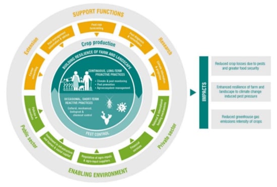 Schematic representation of interdisciplinary approaches and strategies for Climate-Smart Pest Management (CSPM) and its impact. (Reproduced from [157]—licensed under the Creative Commons Attribution).