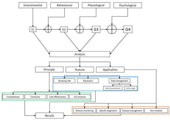 We analyze the devices and deliver descriptive and comparative statistics according to four principles of group, continuous monitoring (duration/power and current consumption), cost, and mode of wearability, features and specifications, and applications (Figure 1).