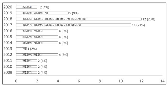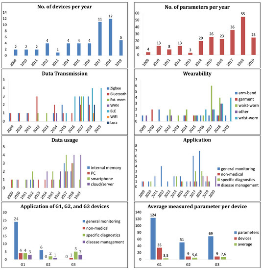 The total number of 53 papers published between 2009 and 2020 met the requirements of this study (Figure 2). Our analysis delivers 35 devices of G1, 9 devices of G2, and 9 devices of G3. G4 has not yet been reported on.