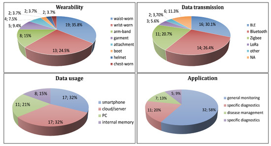 Distribution of wearable devices according to: mode of wearability (top-left), data transmission (top-right), data usage (bottom-left), and application (bottom-right) of the wearable devices.