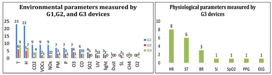 In total, 22 different environmental parameters are measured by G1 devices. Temperature and humidity are measured by 23 and 22 devices, respectively. Nine devices measure CO, NO, and VoCs, which indicates the importance of air pollutants in environmental monitoring. Particular matter, pressure, and O are, each integrated in 7 devices. CO and SO are integrated into 6 and 4 devices, respectively. UV and light are measured by 3 devices (Figure 4, left).