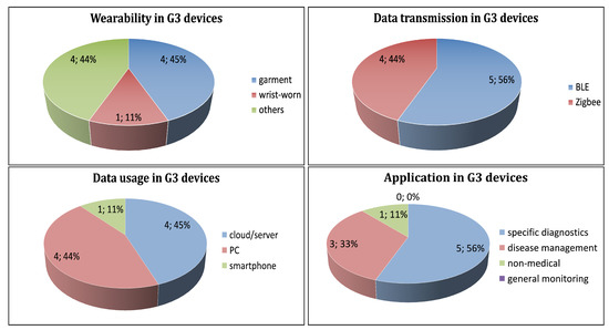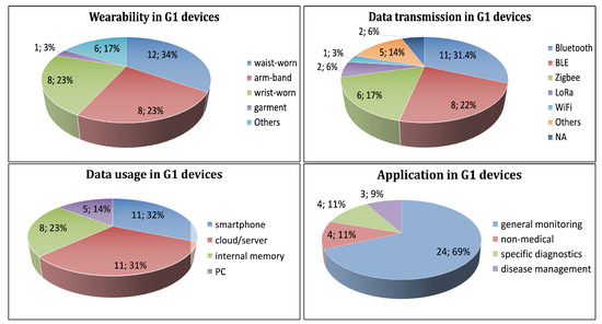 Eight percent of G1 wearables are waist-, wrist-, or arm-worn. Waist-based monitoring is the most popular mode of wearability with 34% (12), wrist- and arm-worn modes are 23% (8) of the devices. Garments and other types are 20% (7) devices (Figure 5, top-left).