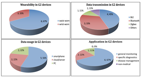G2 wearable devices are waist- or wrist-worn. 67% (6) of the devices are waist-worn and 33% (3) of the devices are worn on wrist (Figure 6, top-left).