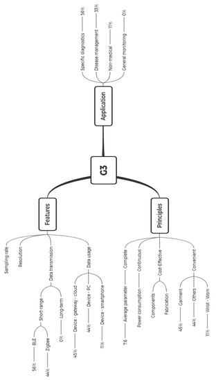 Fifty-eight percent (32) of the devices are used in general monitoring, and 20% (11) of the devices are applied in specific diagnostics. In these devices, the target subjects or/and the study have been specifically defined. Thirteen percent (7) of the devices are used in disease management, and 9% (5) of the devices are applied in non-medical (Figure 3, bottom-right).