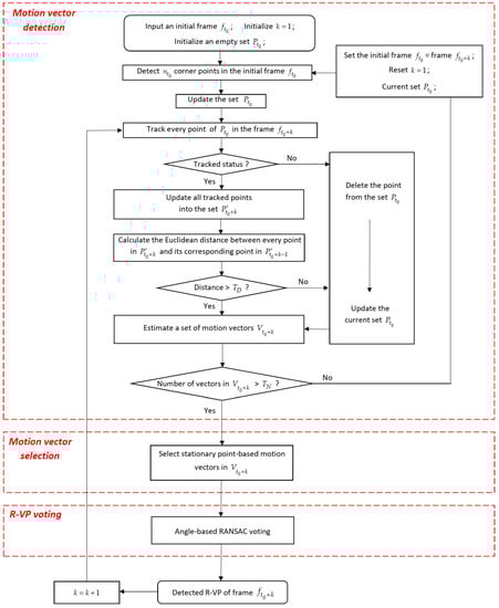 The proposed method also has the same main processing steps as shown in Figure 1. However, the three processing steps are proposed to improve the robustness and real-time ability of the R-VP detection. The flowchart of the proposed R-VP detection method is shown in Figure 3. The following sub-sections describe three processing steps in detail.