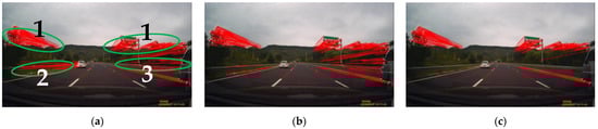 (a) Three types of motion vectors in a driving scene, where motion vectors types 1, 2, and 3 come from the stationary background, accelerating, and decelerating vehicles, respectively. The motion vectors (b) when applying motion vector type 2 reduction sub-step and (c) when applying both motion vector type 2 and 3 reduction sub-steps.