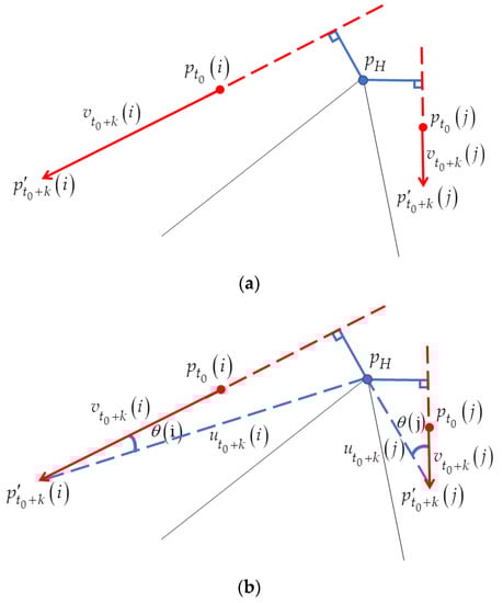 As the angle is smaller when the vector orients closer to the hypothesis, it can be used as a good metric for voting. As shown in Figure 5b, given two vectors and (indicated by the red arrows) have different angles and , unlike the perpendicular distance metric described in Section 2.3 and Figure 5a. Even when two motion vectors move further along their respective directions, the vector orienting closer to the hypothesis has still a smaller angle than another . This is the reason why the angle-based metric is helpful to achieve higher performance of the R-VP detection compared to the perpendicular distance-based one. The angle metric is used in the proposed angle-based RANSAC voting method.