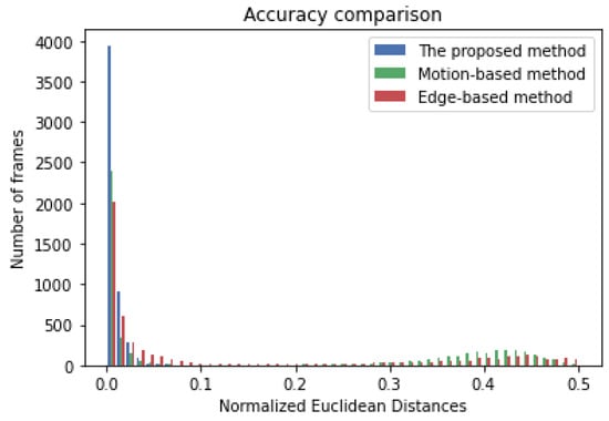 Distribution of normalized error of the proposed (blue), existing motion-based (green), and edge-based (red) R-VP detection methods.