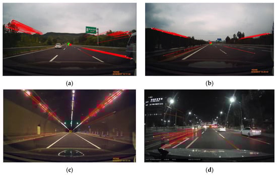 Figure 2a shows motion vectors (indicated as red lines) estimated by the existing motion-based R-VP detection methods. The white dots are the heads of the motion vectors. The remaining endpoints are tails. The direction from a tail to a head and the length of a motion vector represent movement information of a corner point. These motion vectors provide a lot of useful information for a wide variety of computer vision applications. However, in the point of view of the R-VP detection problem, these motion vectors still cause some errors for R-VP detection. In detail, most existing motion-based R-VP detection methods assume that longer motion vectors are more convergent to R-VP locations [34,35,36,37]. However, it can be seen in Figure 2a that the short vectors also coincide on the lanes and road boundaries. The short vectors also contribute well to the R-VP detection. These less distinguishable motion vectors do not provide useful information for selecting vectors that are useful for the R-VP detection problem. It is necessary to enhance motion vector detection that facilitates R-VP detection.
