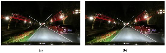 Some examples of the proposed motion-based R-VP detection are shown in Figure 7, where ground-truth and detected R-VPs are indicated as green and red dots, respectively. The motion vectors are also represented by red lines. Examples show that the proposed method works well in various illumination conditions such as bright and slightly dark daytime, tunnel, and nighttime. An extra test is performed for a nighttime scene as the nighttime video is not included in the ground-truth dataset. Note that ground-truth R-VP is not represented in Figure 7d. We observe that the detected R-VP overlaps visually the intersection point of the road boundaries. The red and green dots in Figure 7a–c almost coincide. Two examples of nighttime R-VP detection are shown in Figure 8, where video frames extracted from “ZJU Day and Night Driving Dataset” [60,61] are used without ground-truth R-VPs. White lines are road boundaries drawing by hand and the red circle is detected R-VP. The red circle and the intersection of road boundaries are also almost coincided. Such coincidences demonstrate the accuracy of the proposed method.